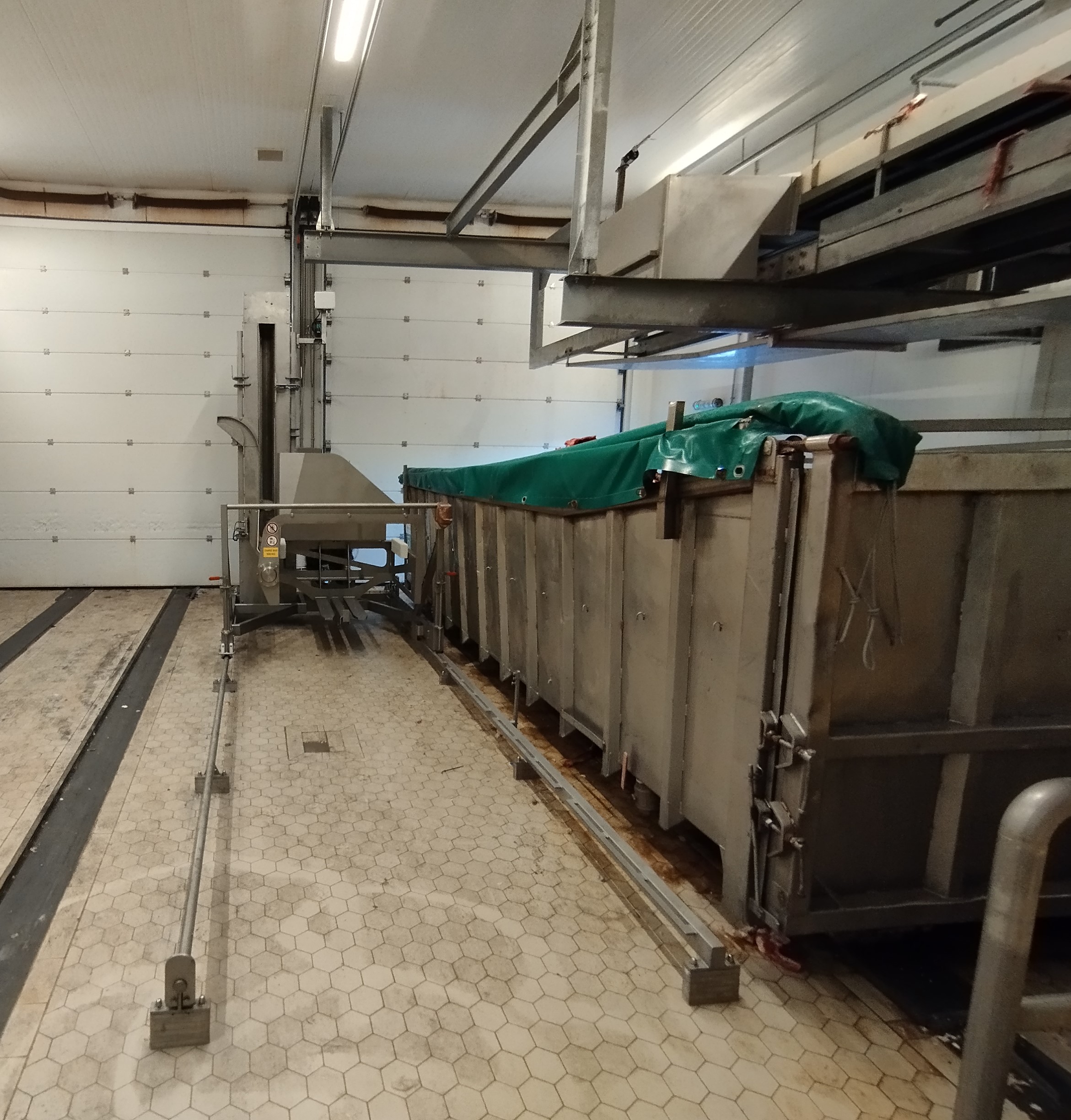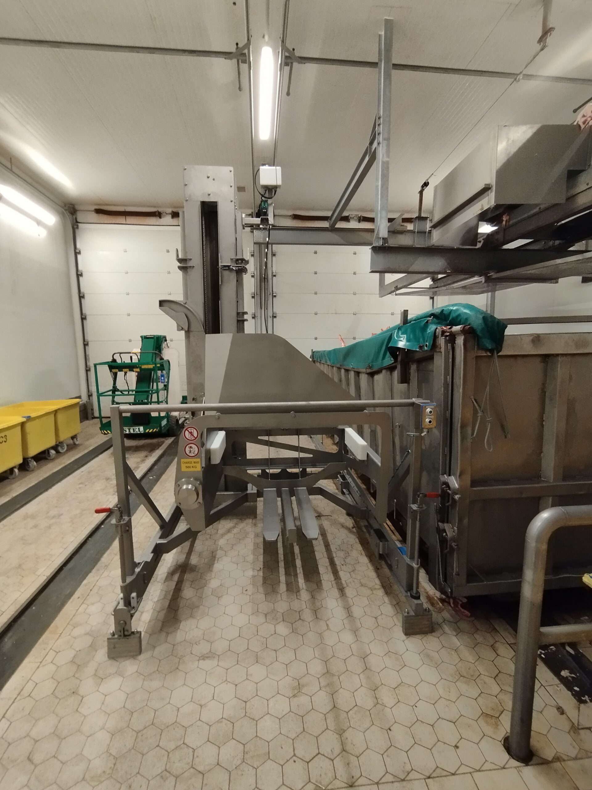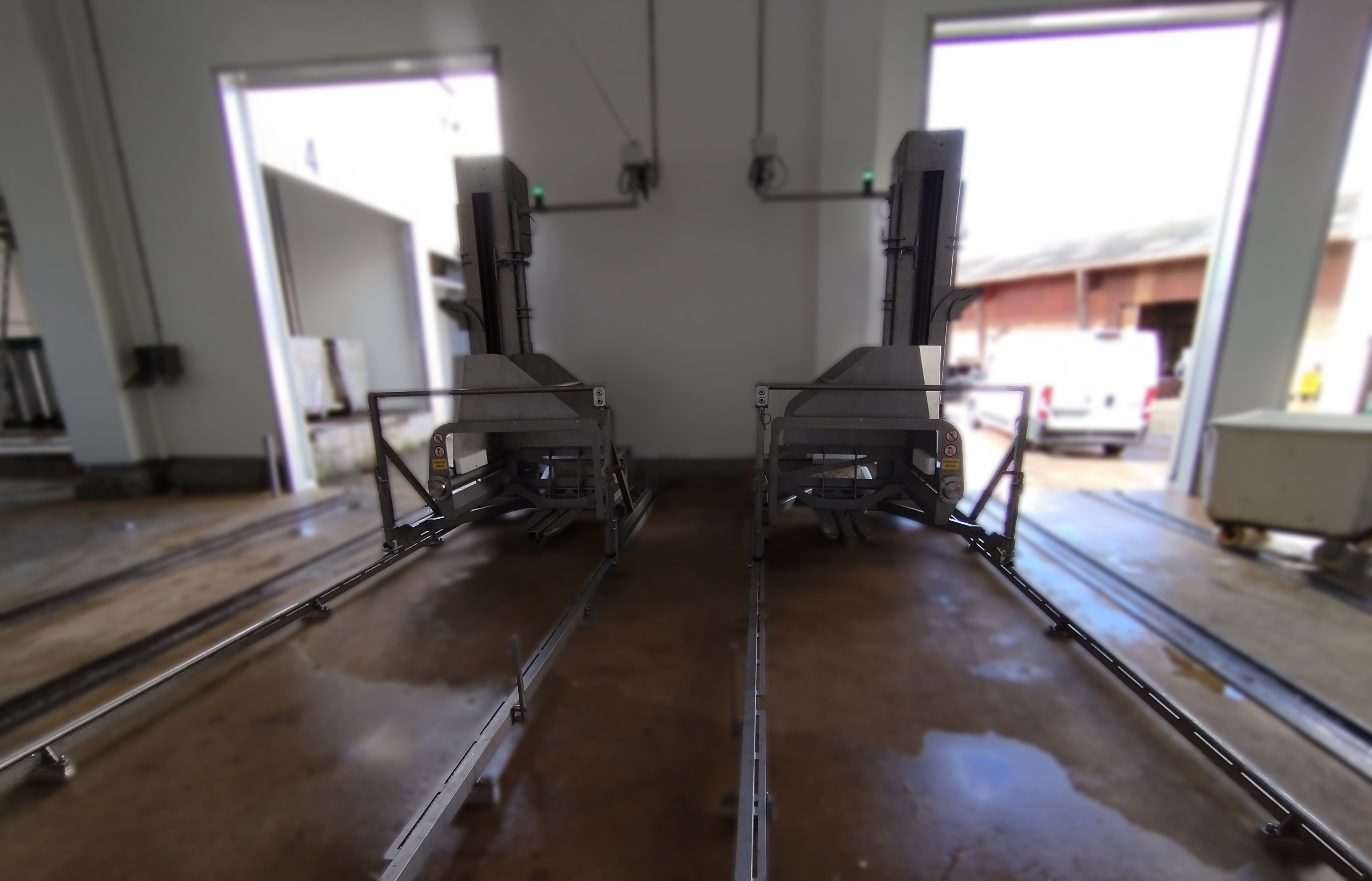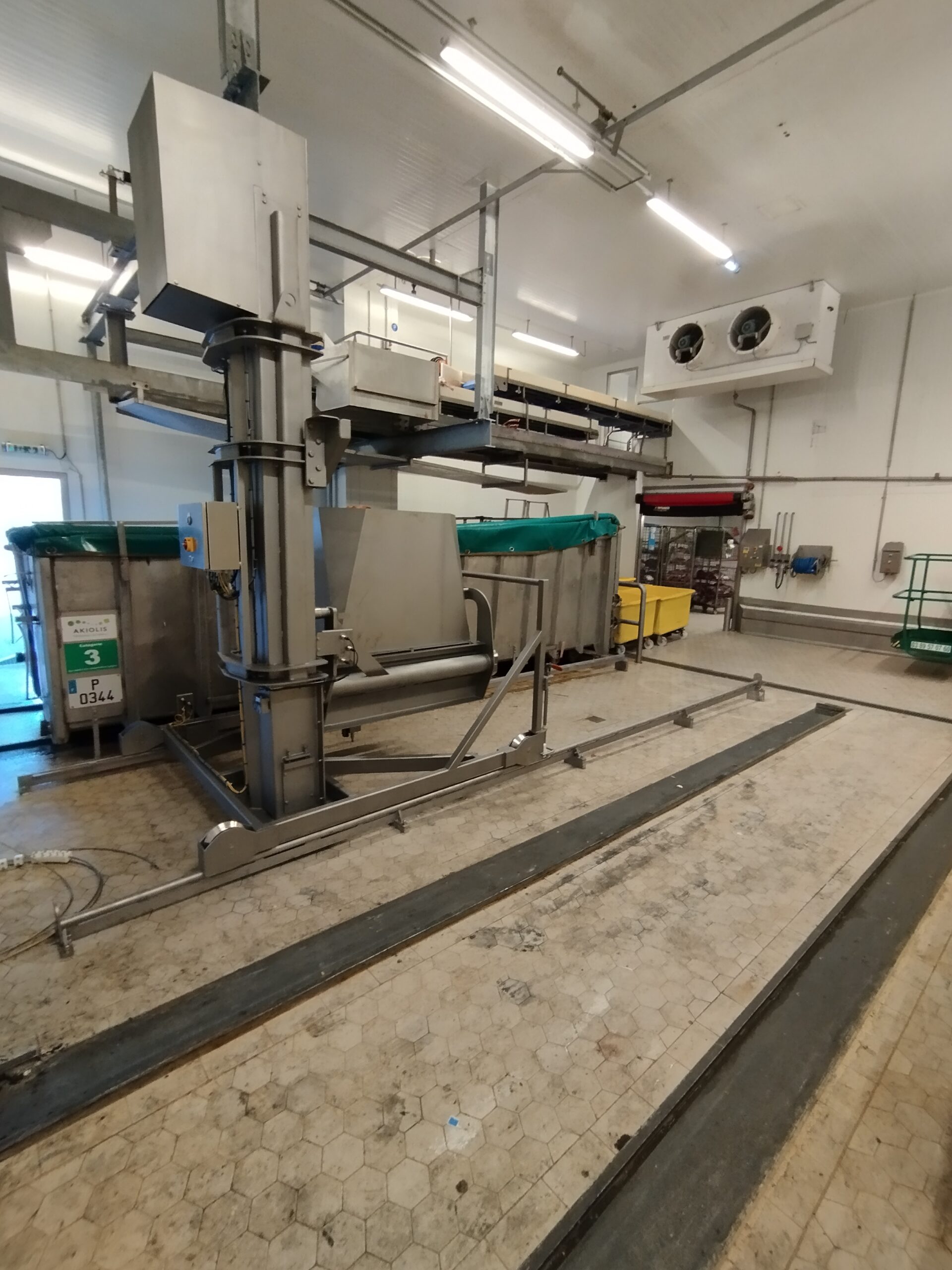 Une belle série d’élévateurs basculeurs mono-colonne pour bacs type Cousin montés sur rails, tout juste installés.
